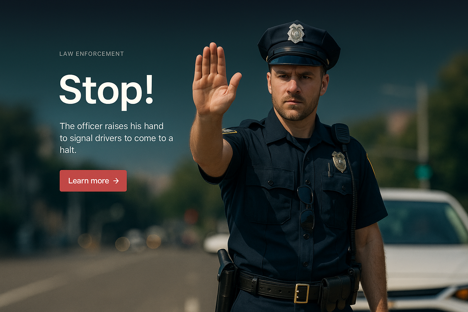 /Collection: /by davooda/Type: PNG/A stylish web design concept featuring a law enforcement officer signaling to stop. The image includes a gradient background and clear text elements for readability.