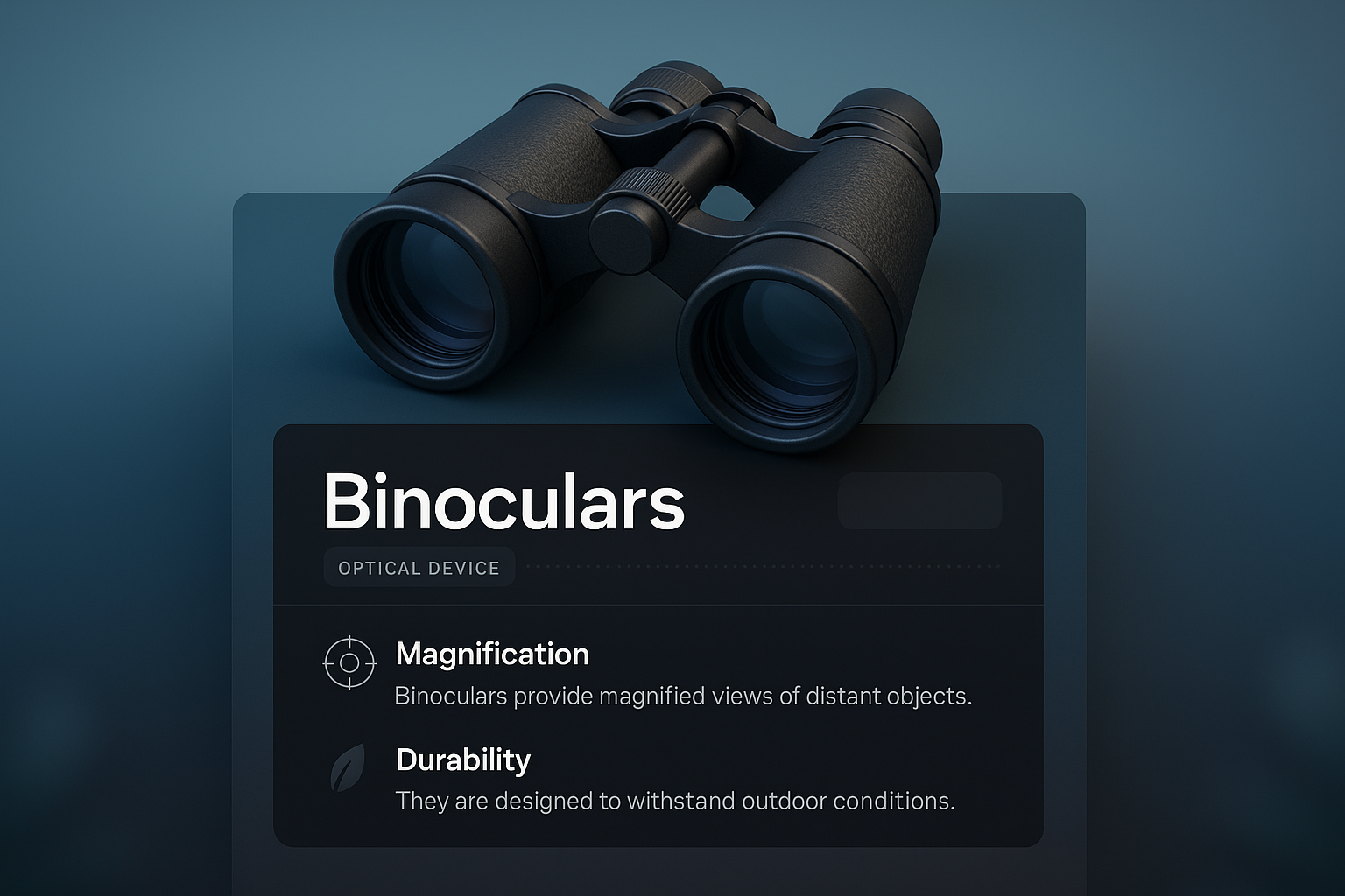 /Collection: /by davooda/Type: PNG/This image features a pair of sleek binoculars on a gradient background, accompanied by a stylish overlay containing essential information about the product, including its magnification and durability.
