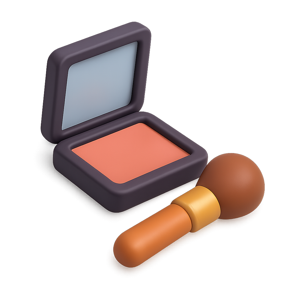 A visually appealing 3D icon of a blush compact featuring a vibrant coral shade. It includes a rounded applicator brush, all rendered in a sleek, isometric style with a transparent background.
