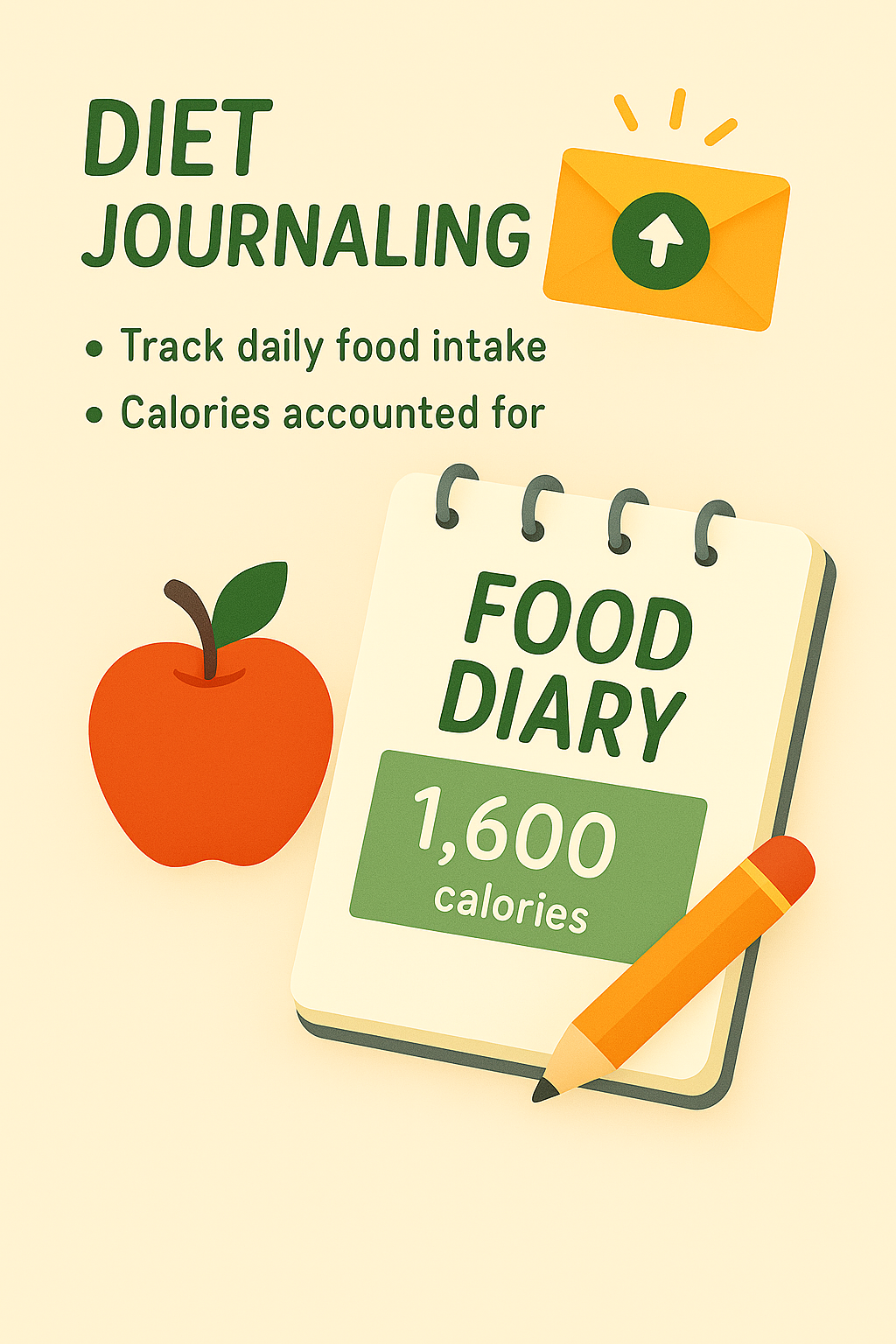 A vibrant illustration depicting a food diary concept for diet journaling, featuring an apple, notepad, and pencil. Ideal for health and wellness applications.