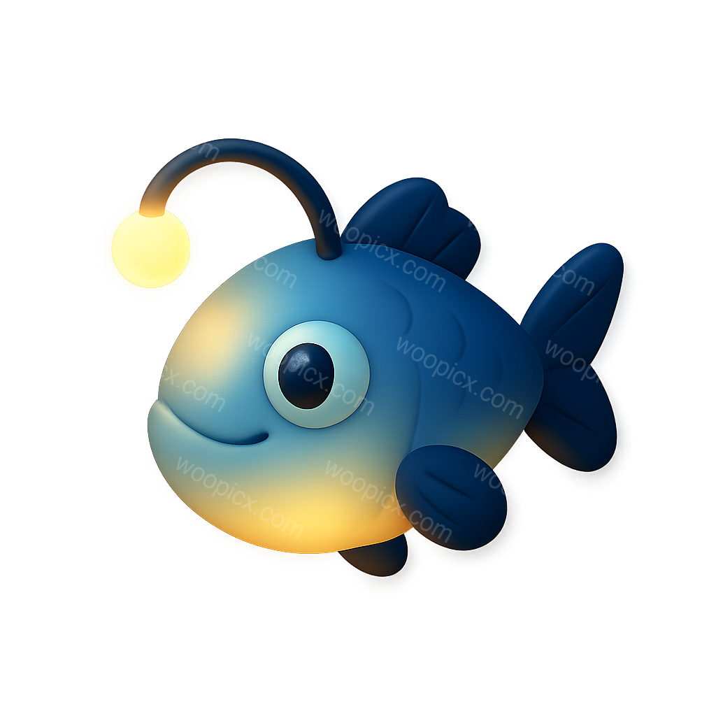 A charming cartoon-style blue fish with a glowing light on its head, perfect for children's illustrations or aquatic-themed designs.