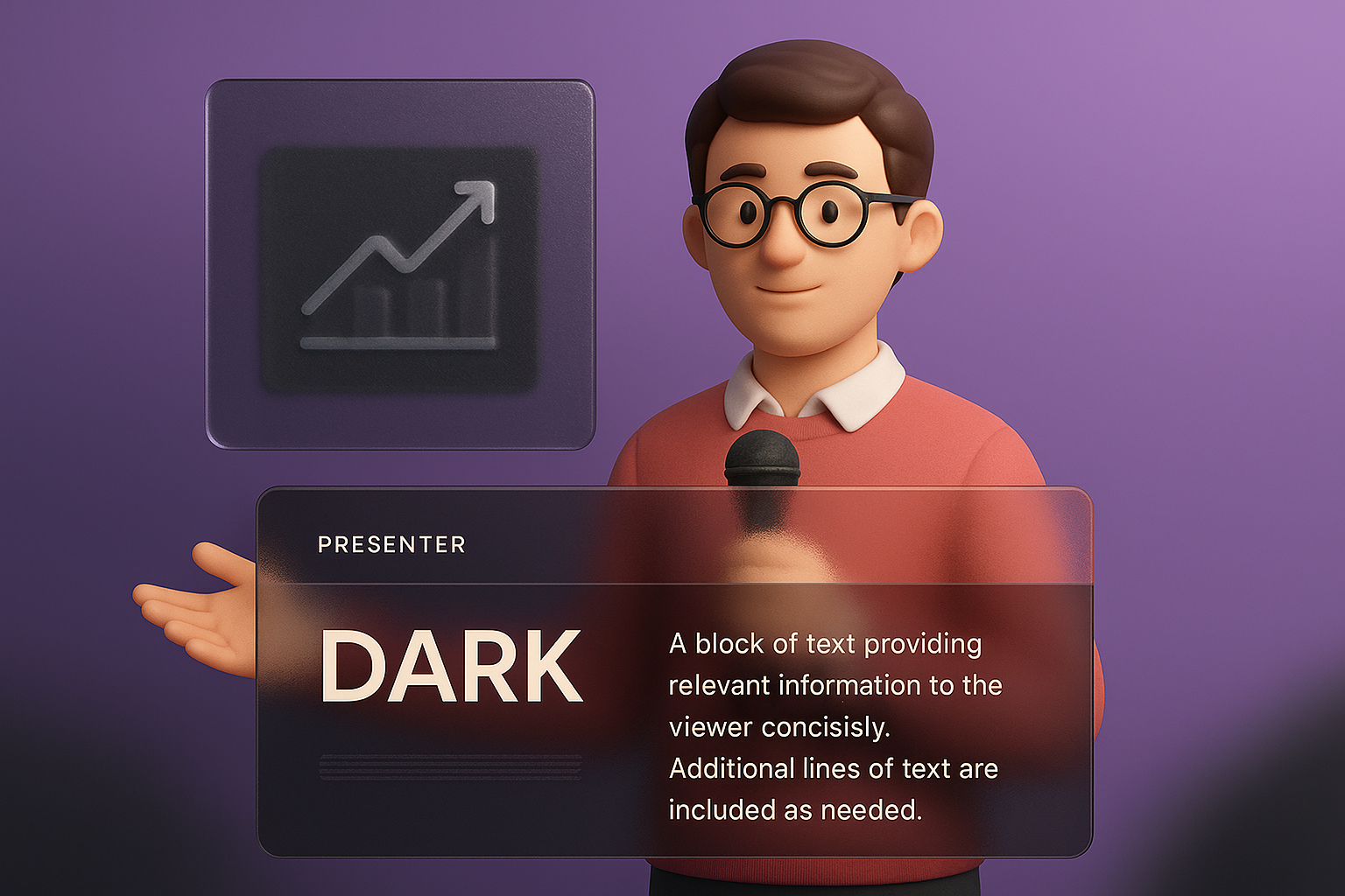 A 3D illustration of a presenter holding a microphone, integrated with dark-themed text blocks and graphical elements, creating a cohesive web page design.