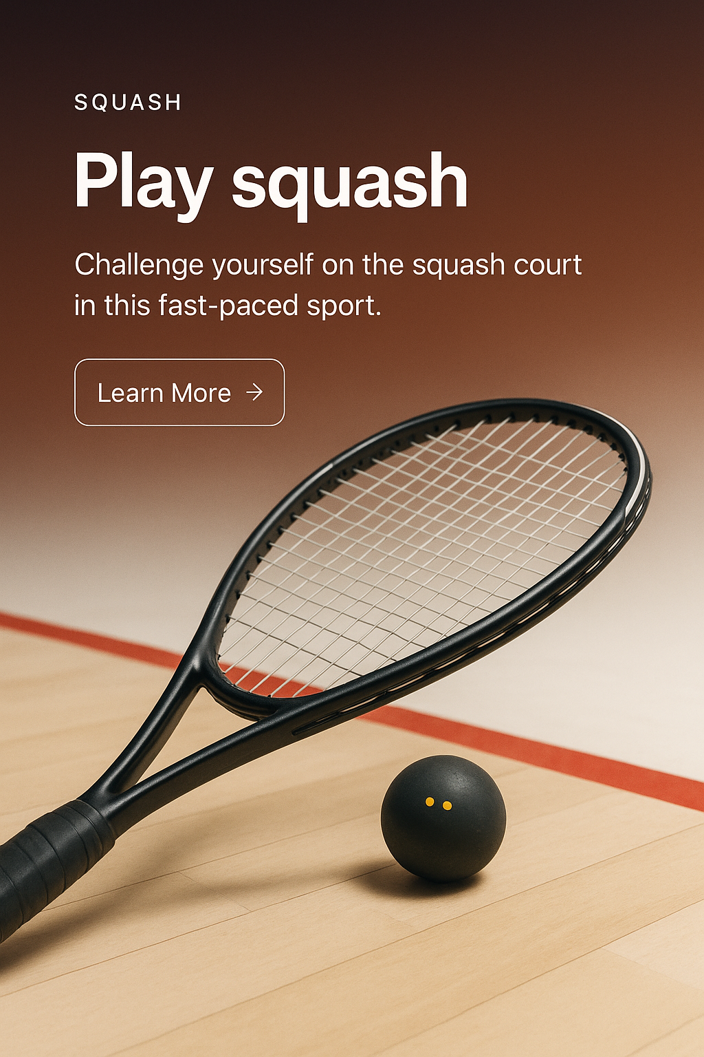 An engaging web page design featuring a squash racket and ball. The layout includes a bold title, a descriptive text block, and a call-to-action button, all set against a gradient backdrop.