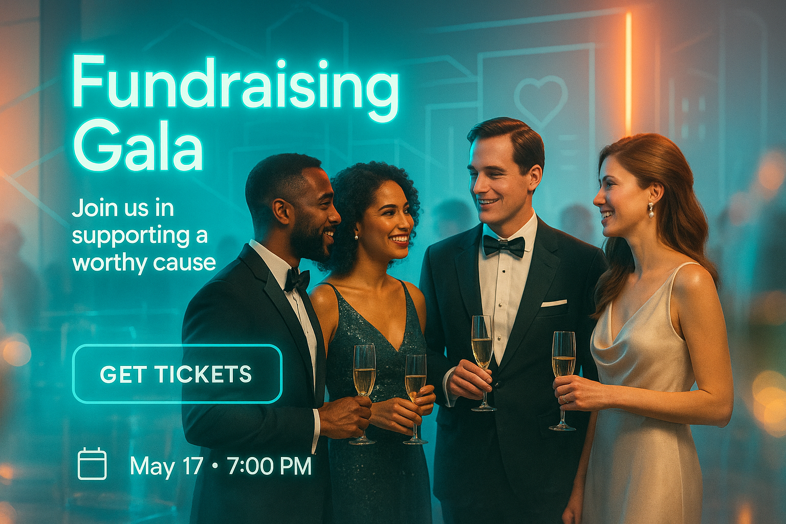 /Collection: /by davooda/Type: PNG/Stylish promotional image for a fundraising gala, featuring attendees in formal attire. The vibrant colors and modern design make it suitable for social media and event marketing.