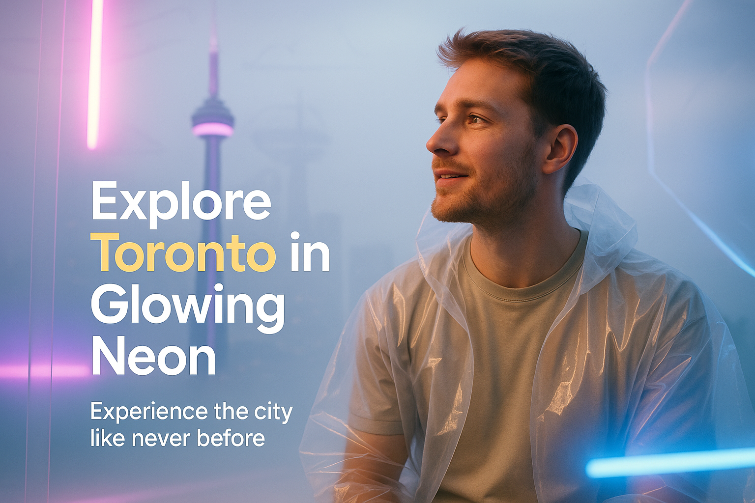 Vibrant promotional image showcasing a young man in a neon-themed urban setting, ideal for travel marketing or city exploration campaigns.