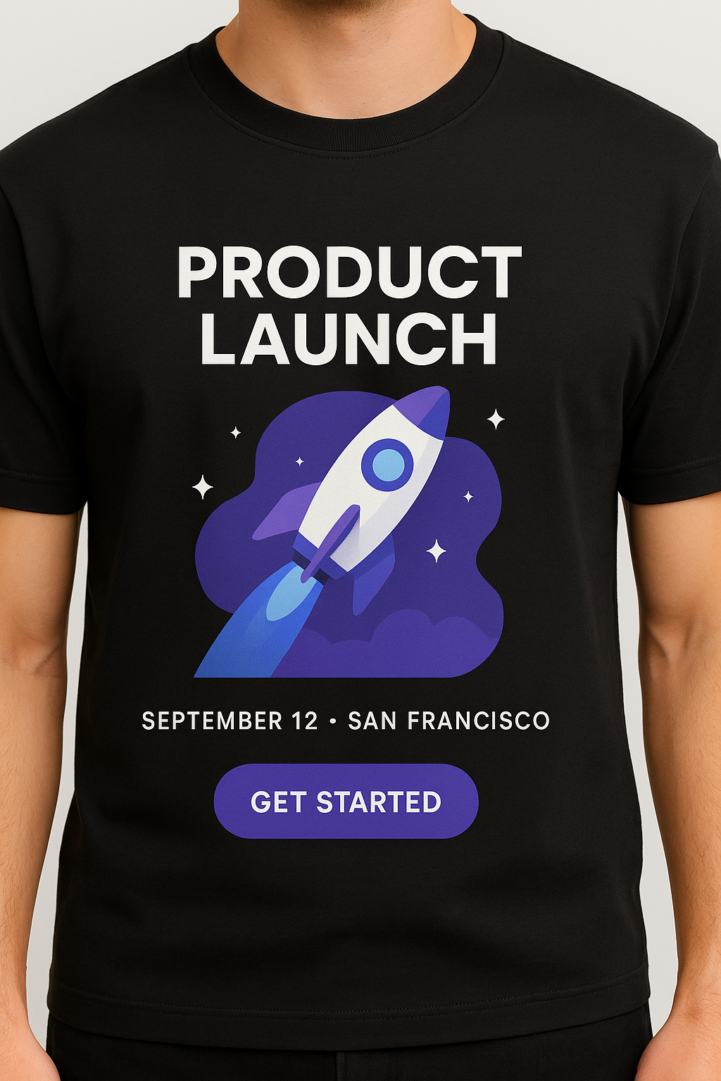 Stylish t-shirt design featuring a rocket graphic for a product launch event. Ideal for promotional giveaways at tech conferences or startup events.