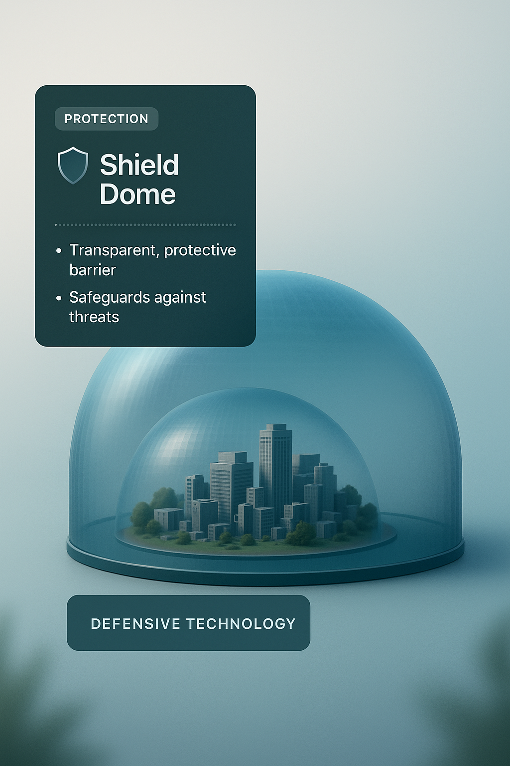 /Collection: /by davooda/Type: PNG/A captivating 3D illustration of a shield dome featuring a transparent barrier around a miniature urban landscape. The design emphasizes protection and defensive technology.