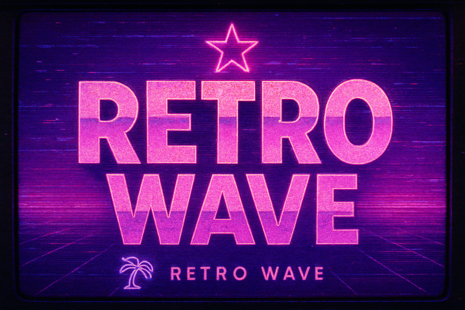 Stylish graphic featuring the words 'RETRO WAVE' in bold, neon typography. The design incorporates a star and palm tree motif, ideal for retro-themed events or digital content.
