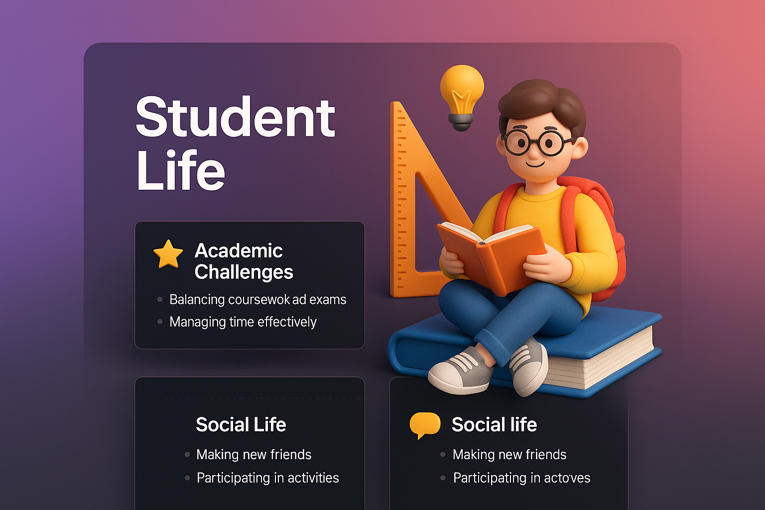 /Collection: /by davooda/Type: PNG/A vibrant 3D illustration depicting student life, featuring a character reading with a backpack, surrounded by elements symbolizing academic and social activities.