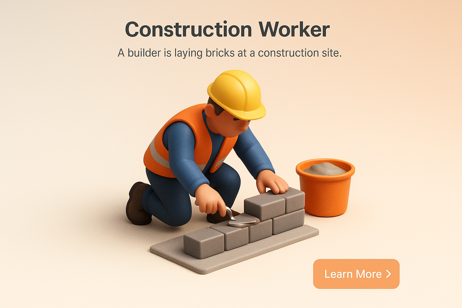 /Collection: /by davooda/Type: PNG/A zoomed-out 3D illustration depicting a construction worker laying bricks at a site. The scene features a gradient background, small text elements, and an action button.