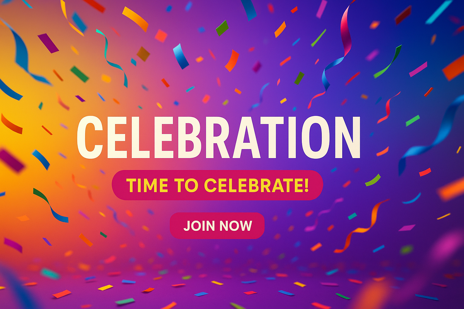 Colorful celebration graphic featuring confetti and vibrant gradients, ideal for event promotions or festive announcements. Engaging design invites participation.
