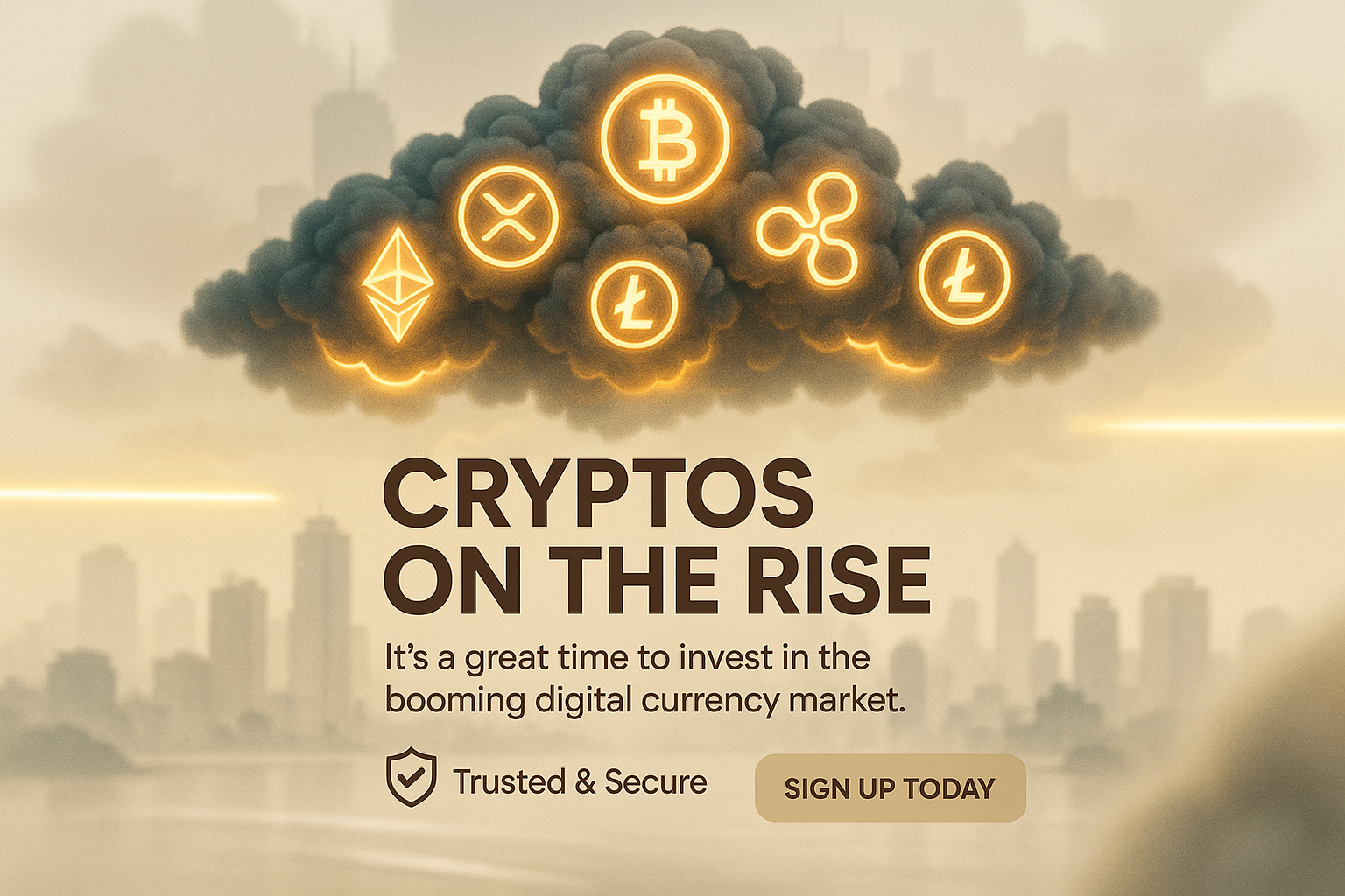 Engaging promotional banner highlighting the rise of cryptocurrencies with a modern design, aimed at attracting potential investors in the digital currency market.