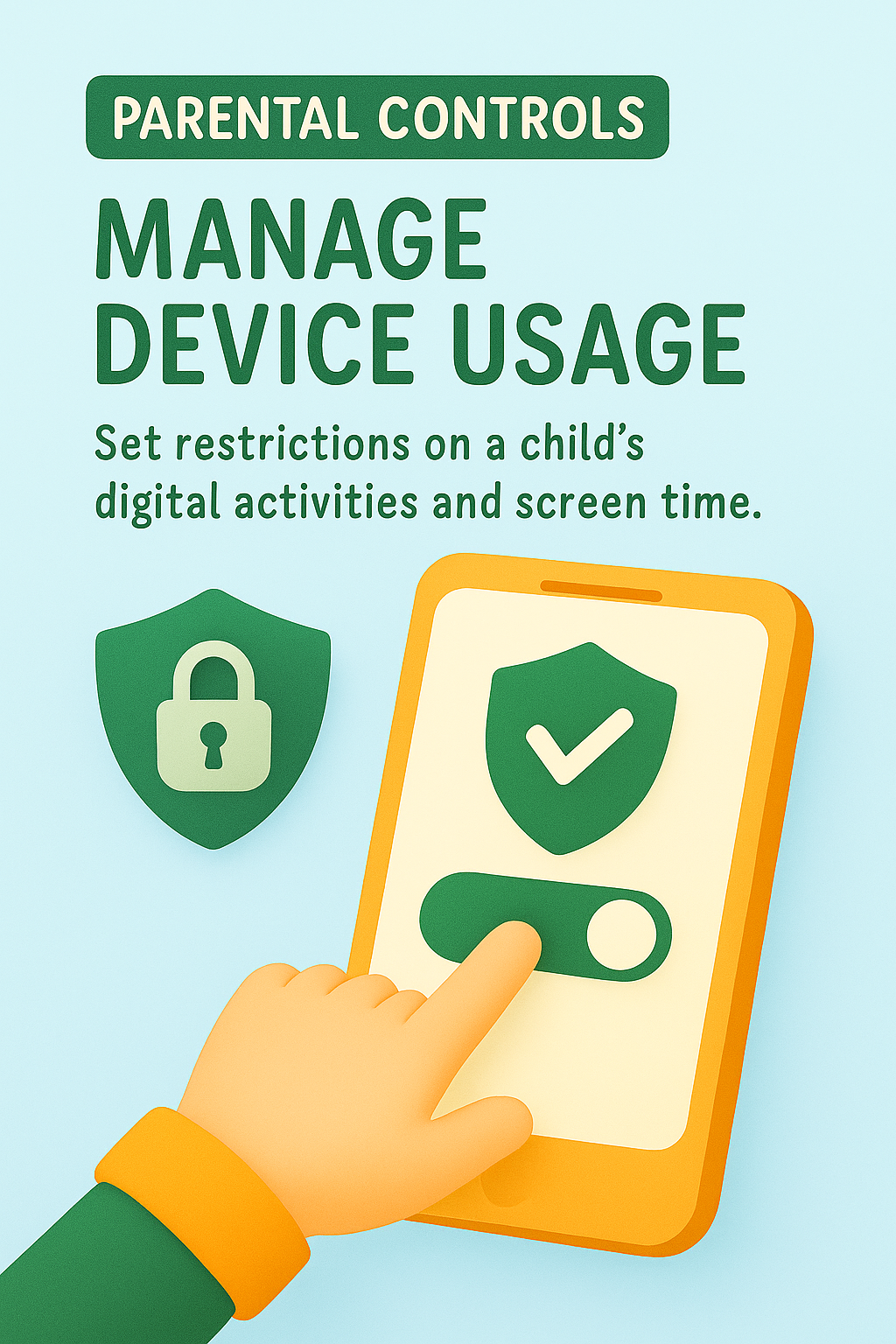 /Collection: /by davooda/Type: PNG/Informative graphic illustrating parental control features for managing device usage, featuring a colorful and engaging design aimed at parents concerned about children's screen time.