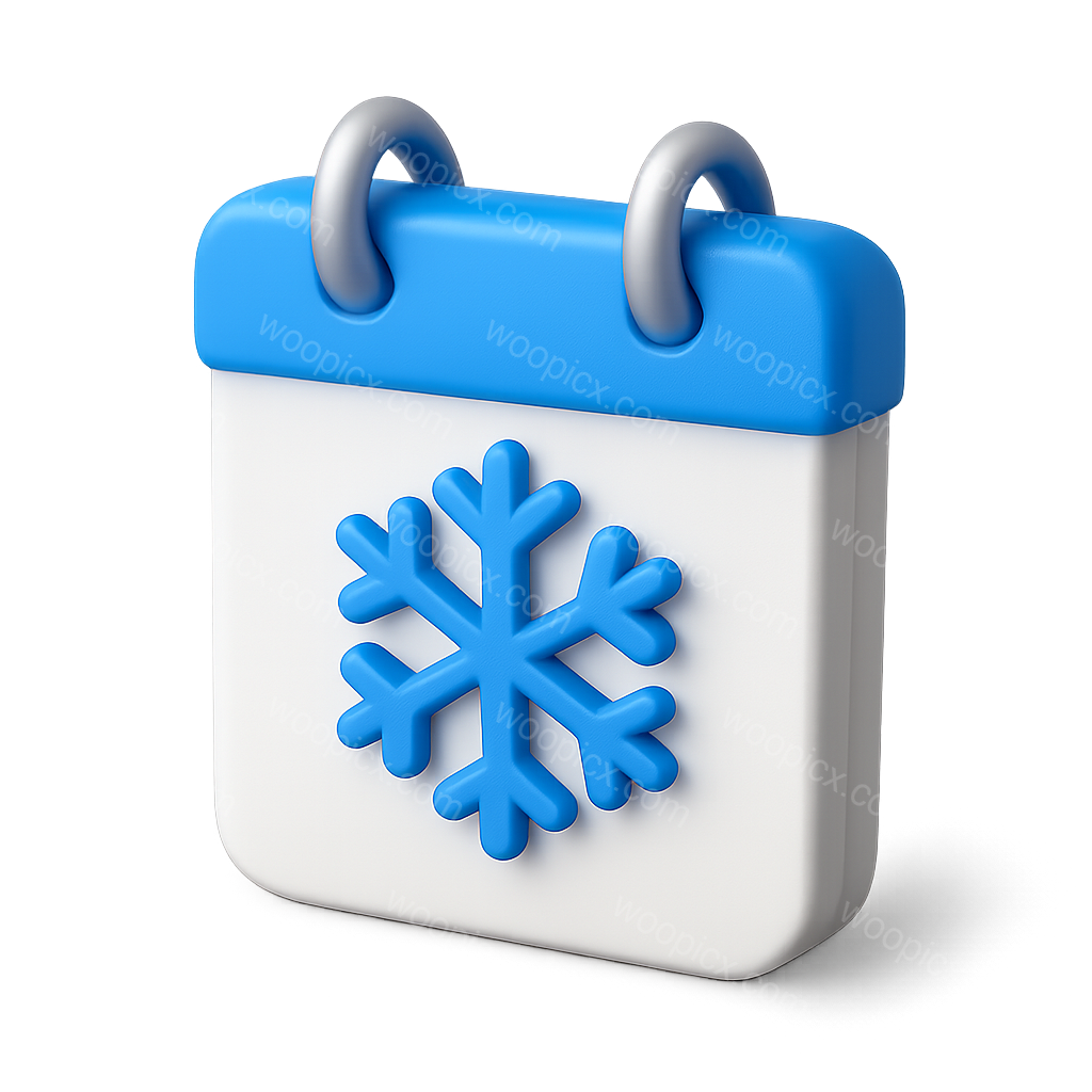 A visually appealing 3D calendar icon featuring a blue snowflake design. The icon has a three-quarter view with a transparent background, enhancing its volumetric appearance.