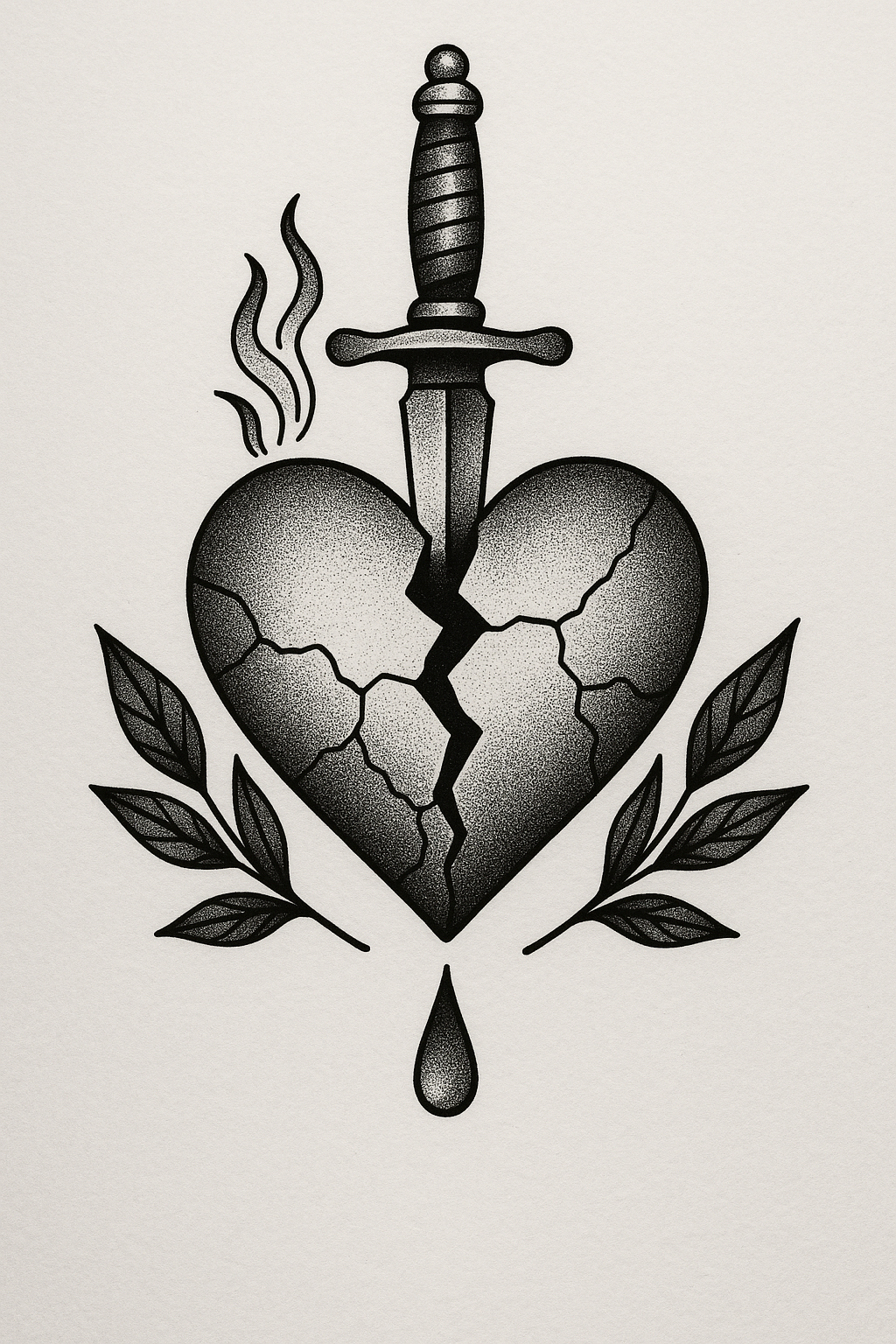 /Collection: /by davooda/Type: PNG/This is a tattoo-style illustration featuring a cracked heart pierced by a dagger, surrounded by leaves. It combines elements of love and pain, appealing to a niche audience interested in body art.