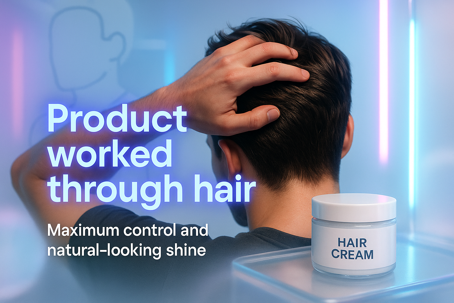 Stylish promotional image showcasing a hair cream product with a focus on application technique, ideal for beauty and grooming marketing.