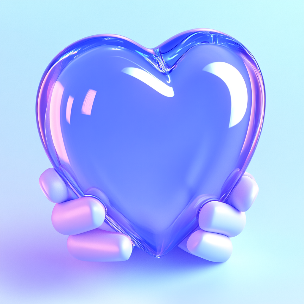 A vibrant 3D graphic featuring a glossy glass heart held by stylized hands, ideal for digital art, social media posts, and romantic themes.
