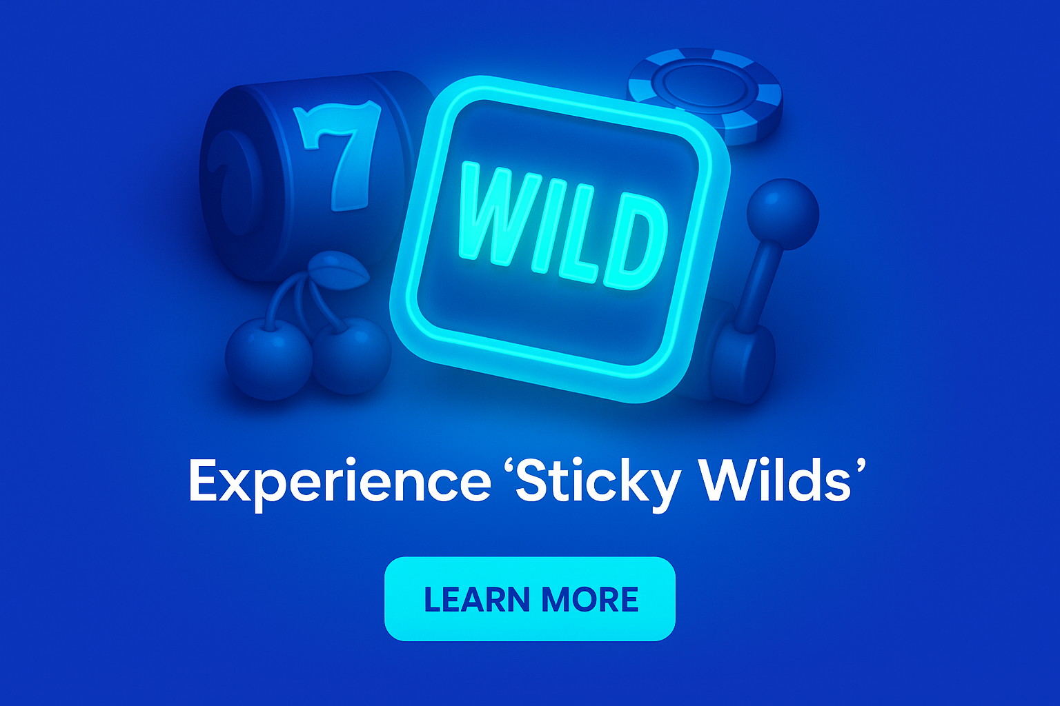A vibrant and immersive design featuring glowing elements that represent the 'Sticky Wilds' theme. The neon aquamarine glow contrasts with a solid blue background, creating a captivating atmosphere.