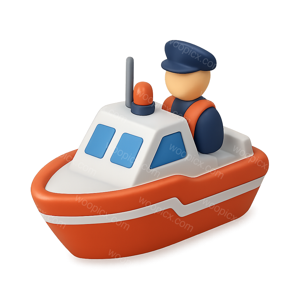 A vibrant 3D icon of a coast guard patrol boat featuring a figurine in a uniform. The design is simplistic with a transparent background, showcasing a three-quarter view.