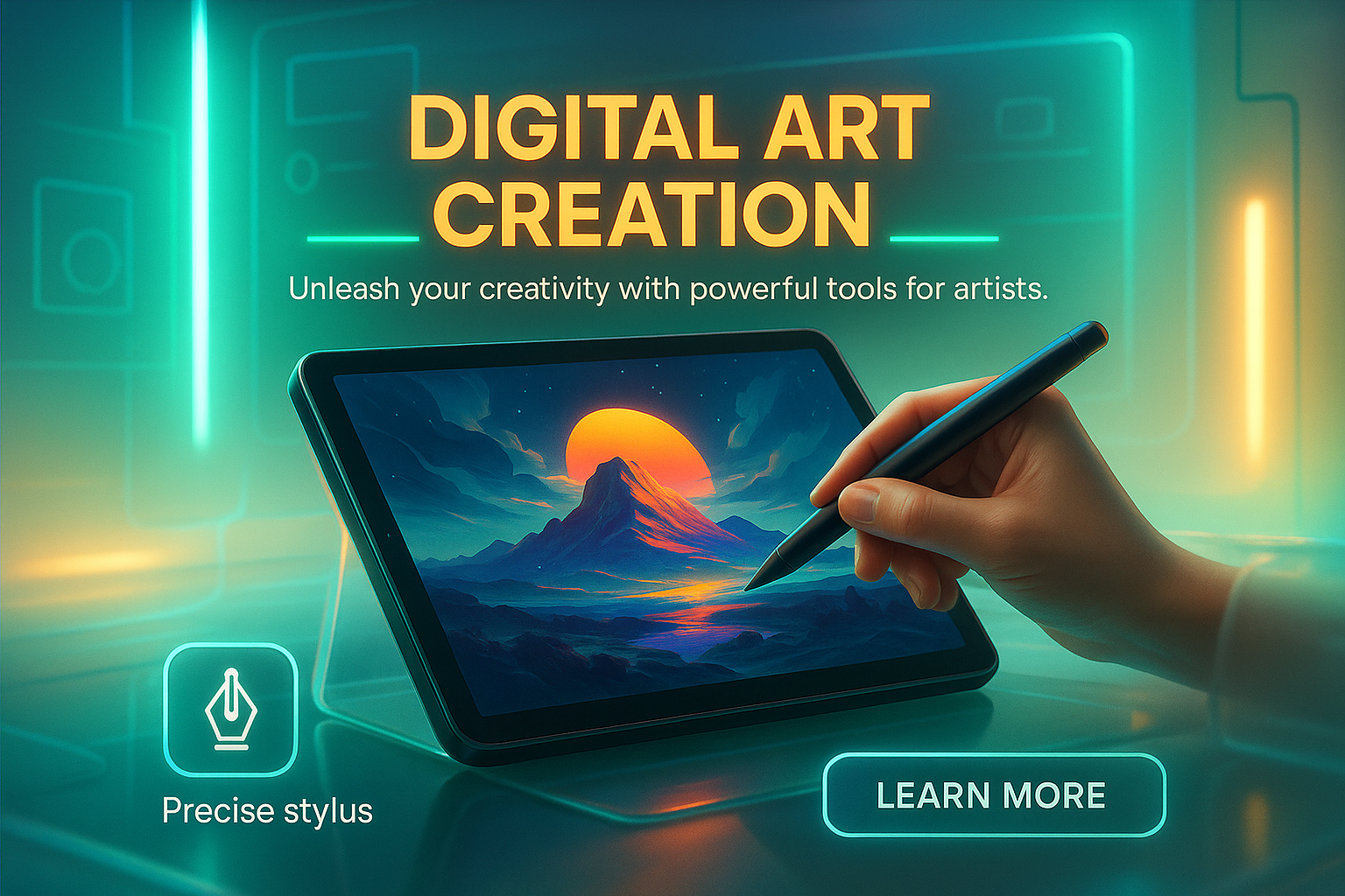 /Collection: /by davooda/Type: PNG/A promotional graphic showcasing digital art creation tools, featuring a stylus in use on a tablet with a vibrant landscape illustration. Ideal for marketing to artists and creatives.