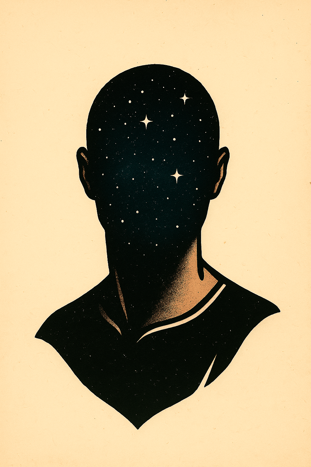 /Collection: /by davooda/Type: PNG/This artwork features a silhouette of a human head filled with a starry cosmos, symbolizing the vastness of the universe within a person. The background is a soft beige, enhancing the contrast of the dark figure and the stars.