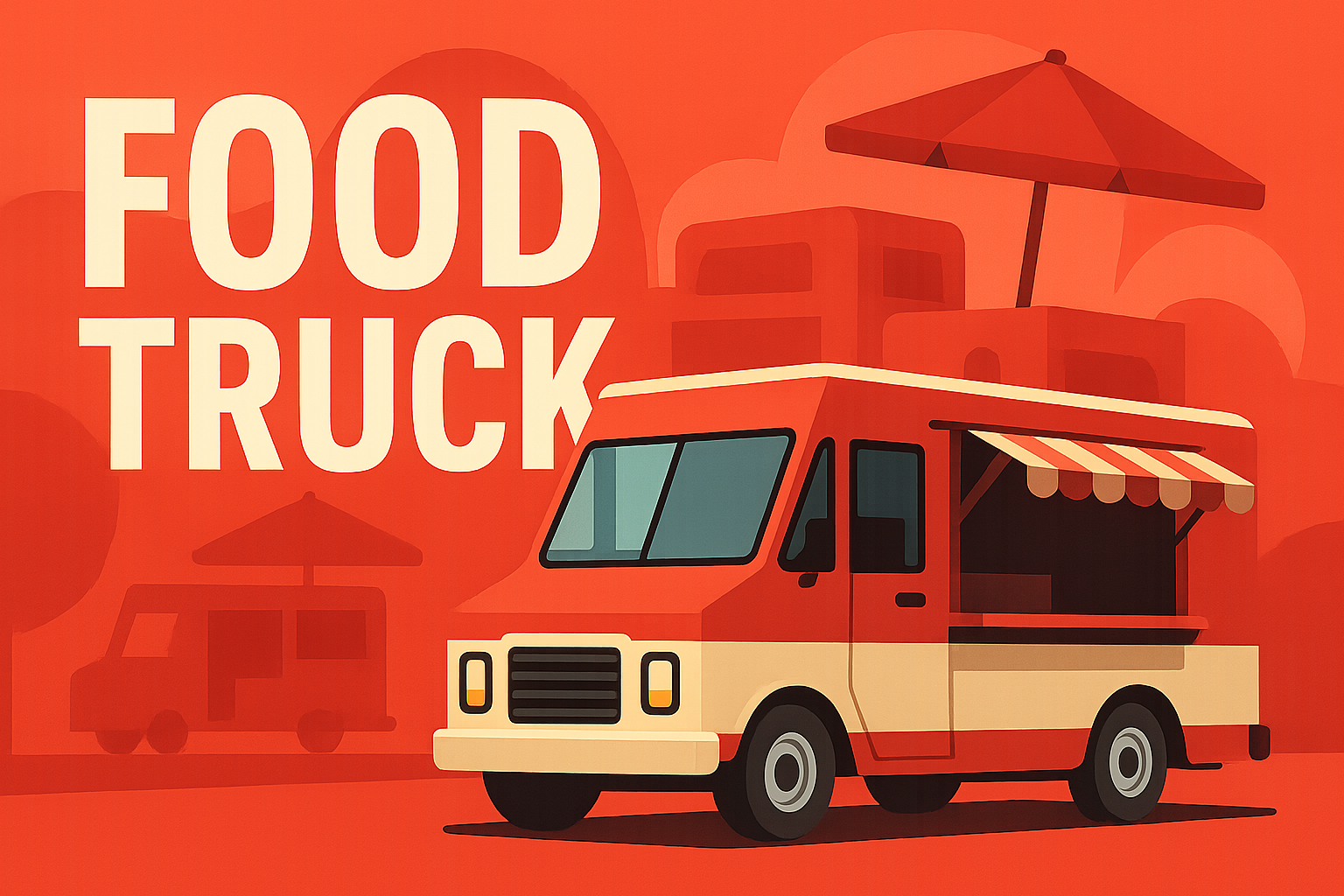 A vibrant and modern illustration of a food truck set against a bold red background, designed for promotional use in food-related marketing or events.