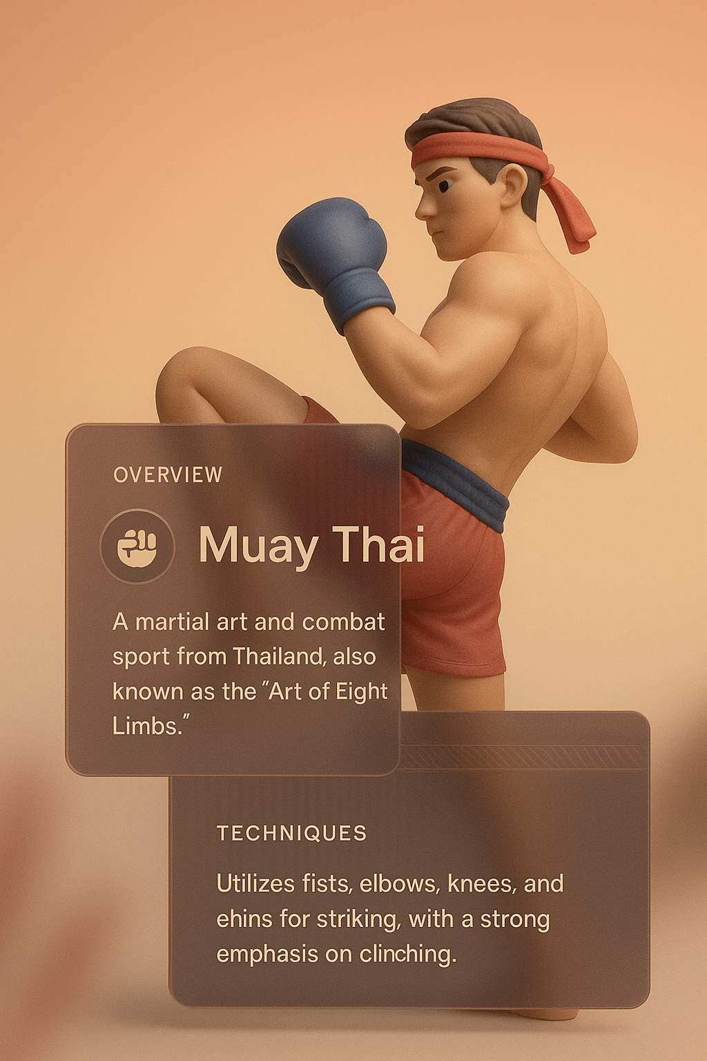 /Collection: /by davooda/Type: PNG/A modern web page concept featuring a 3D Muay Thai illustration, with integrated text blocks and stylish design elements. The layout ensures readability with a light tone and layered composition.