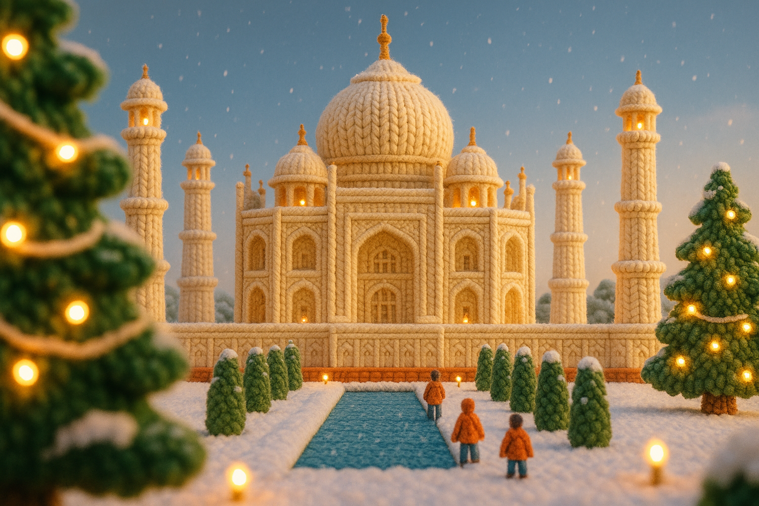 A whimsical 3D depiction of the Taj Mahal, intricately designed with thick yarn. The scene features snow, small figures, and warm lights, creating a festive atmosphere.