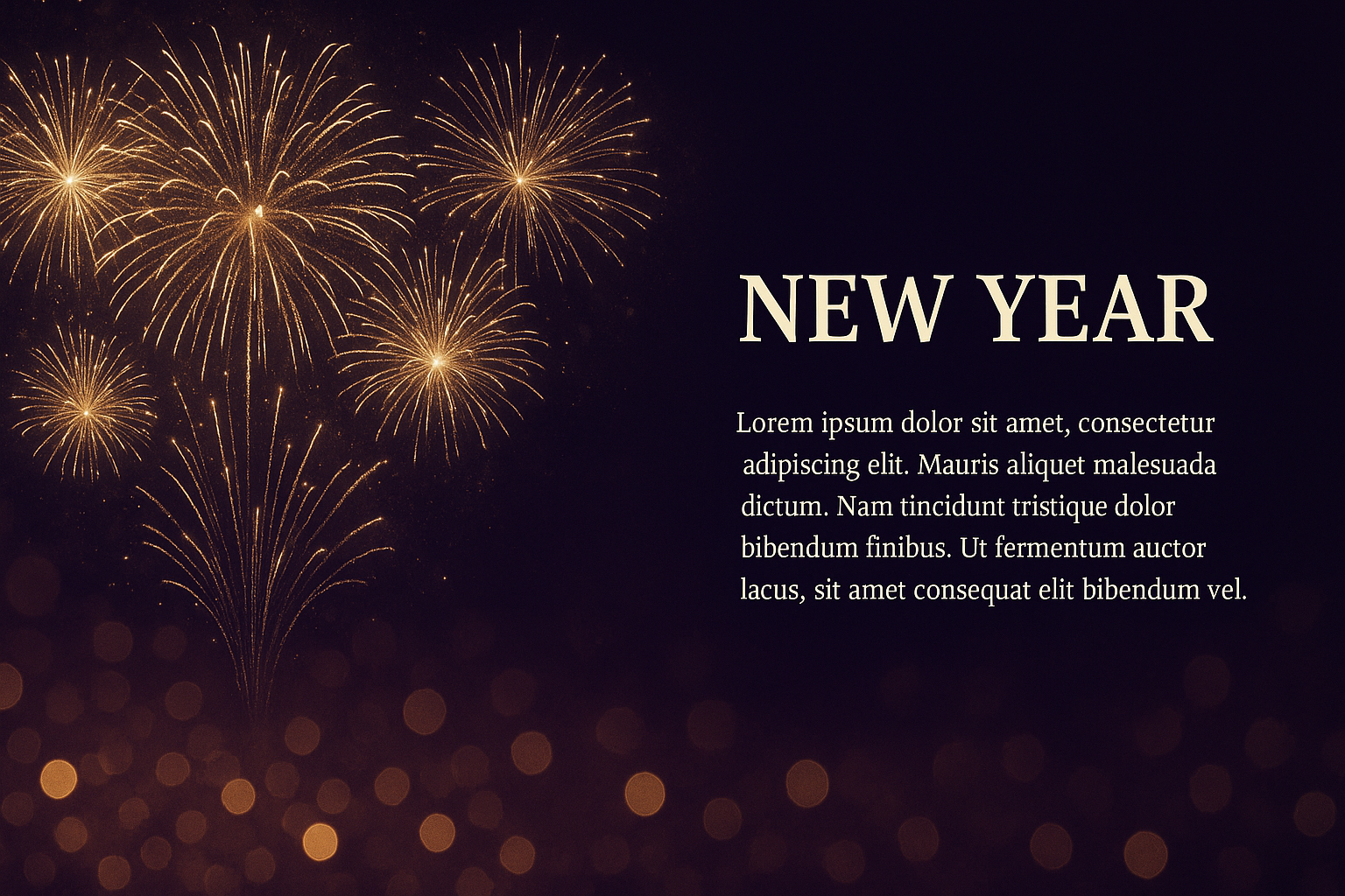 Festive graphic featuring fireworks against a dark background, ideal for New Year celebrations. The design combines elegant typography with a celebratory theme.