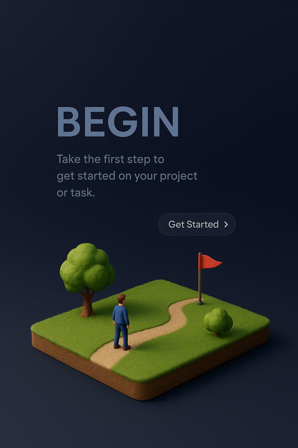 A zoomed-out 3D scene featuring a person standing on a path, flanked by a tree and a flag, set against a dark gradient background. The design invites viewers to take the first step in their project.