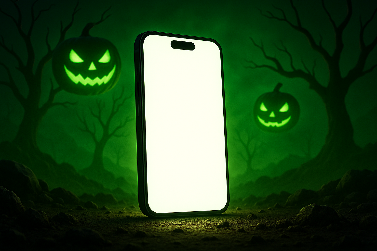 /Collection: /by davooda/Type: PNG/A creatively designed smartphone with a blank screen set against a spooky Halloween backdrop featuring eerie green lighting and grinning jack-o'-lanterns. Ideal for seasonal marketing or tech promotions.