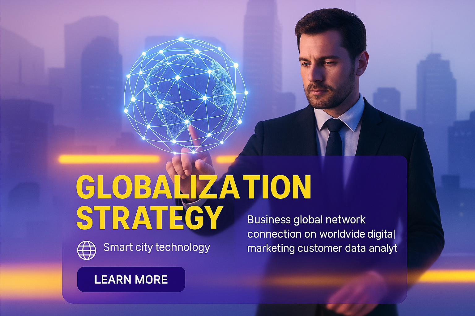 /Collection: /by davooda/Type: PNG/A professional promotional graphic showcasing globalization strategy in digital marketing, featuring a businessman interacting with a digital network representation, ideal for corporate presentations.