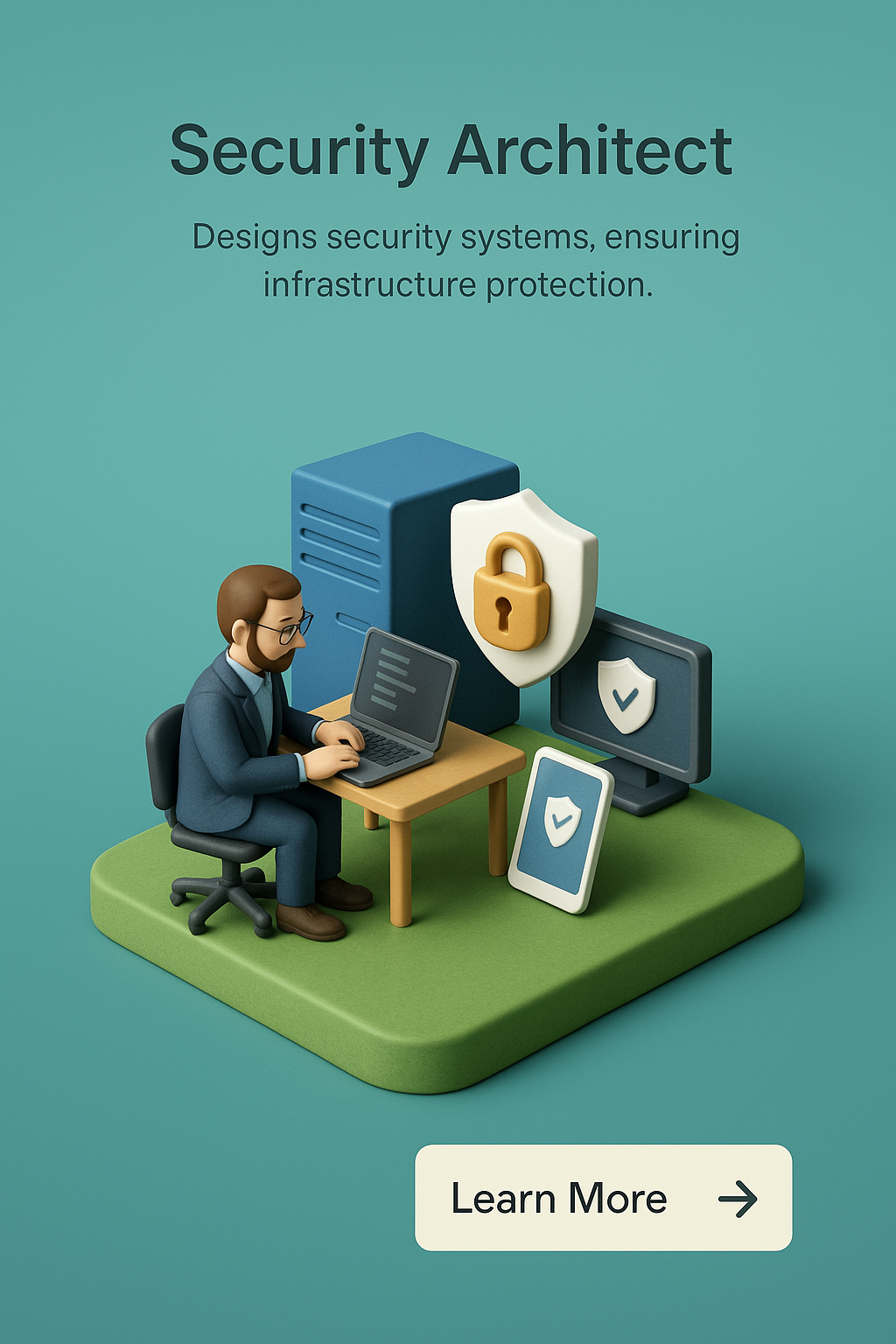 A detailed 3D illustration of a security architect working on a laptop, surrounded by security elements like shields and servers, set against a smooth gradient background.