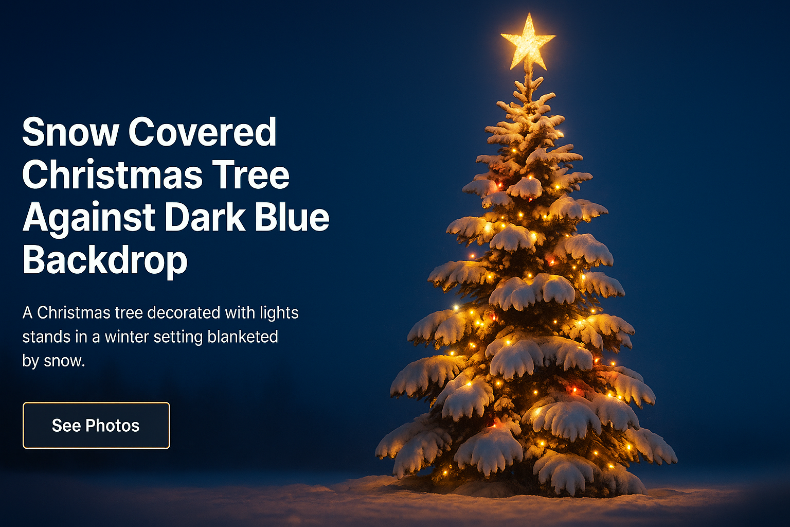 A beautifully lit Christmas tree adorned with snow and lights stands out against a rich dark blue background, creating a festive winter atmosphere.