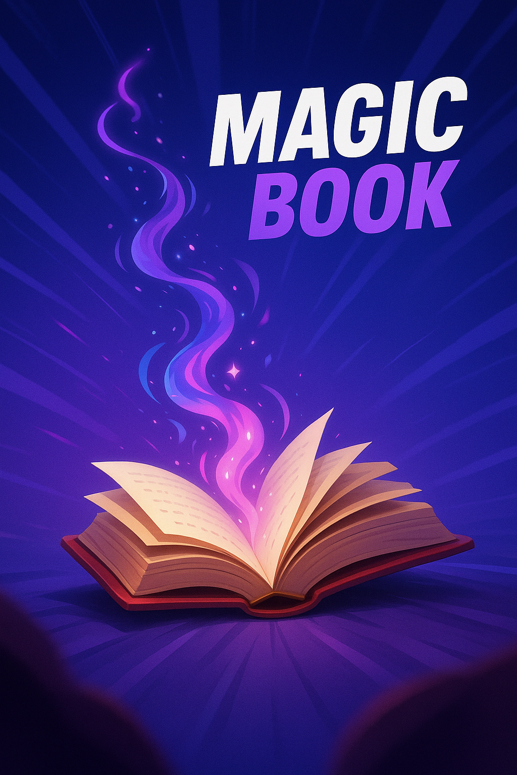 /Collection: /by davooda/Type: PNG/An enchanting illustration of an open magic book, emitting colorful wisps and sparkles. The background features a smooth gradient with dynamic rays, creating a captivating atmosphere.