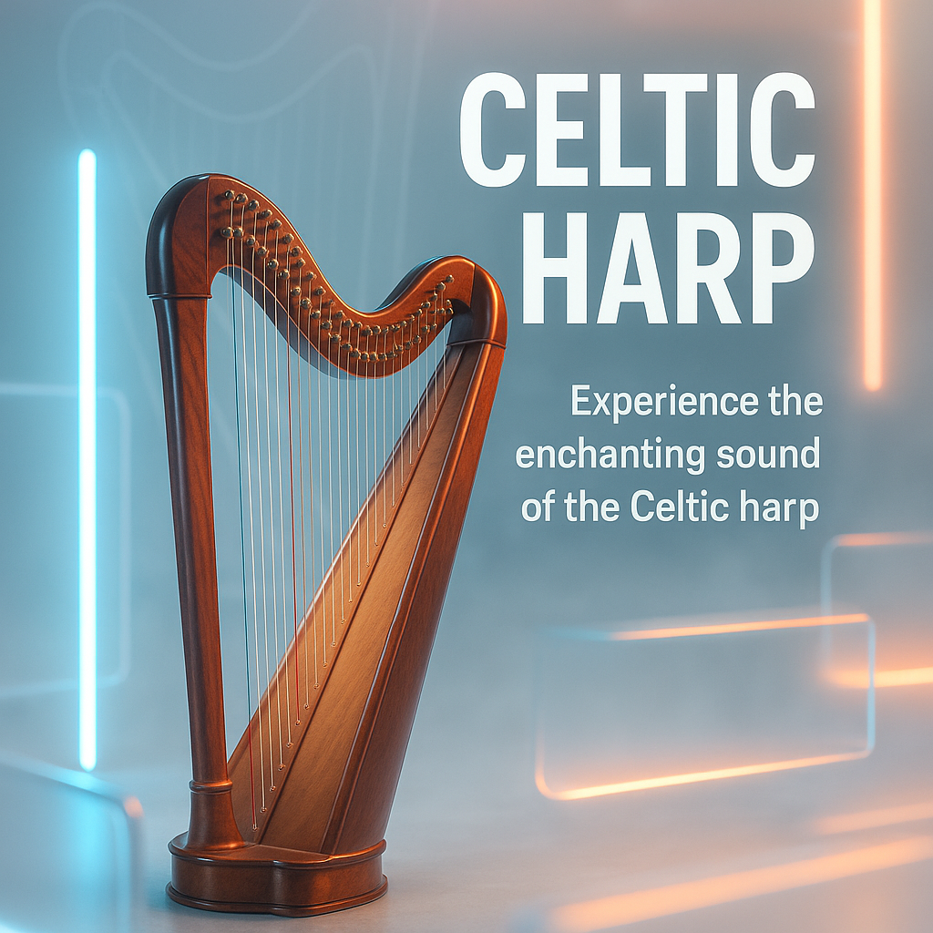/Collection: /by davooda/Type: PNG/A visually striking 3D rendering of a Celtic harp, enhanced by contemporary lighting effects. Ideal for music-related promotions or educational content about musical instruments.