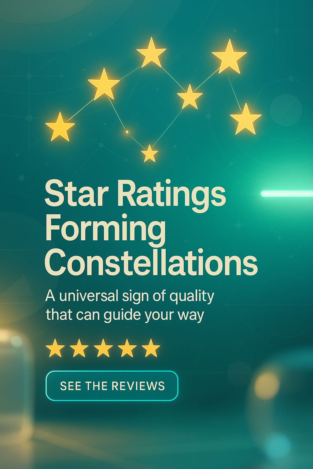 Promotional Graphic Featuring Star Ratings and Constellation Theme