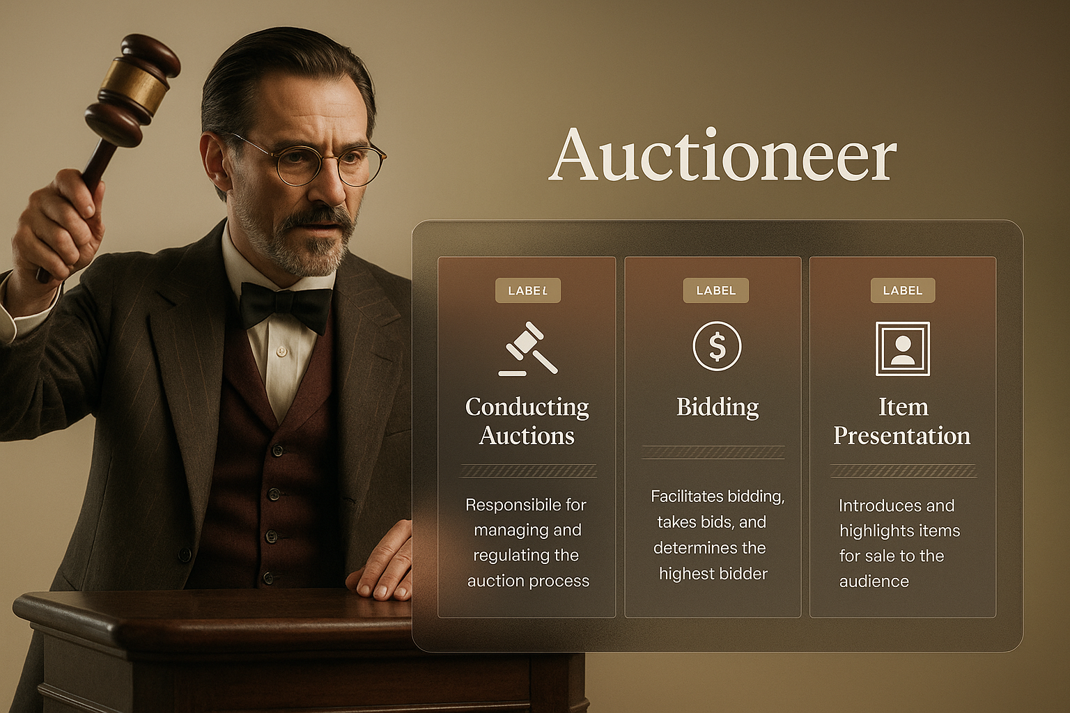/Collection: /by davooda/Type: PNG/A stylish illustration of an auctioneer presenting auction details. The design includes integrated label blocks with a smooth gradient background, emphasizing readability and a cohesive aesthetic.