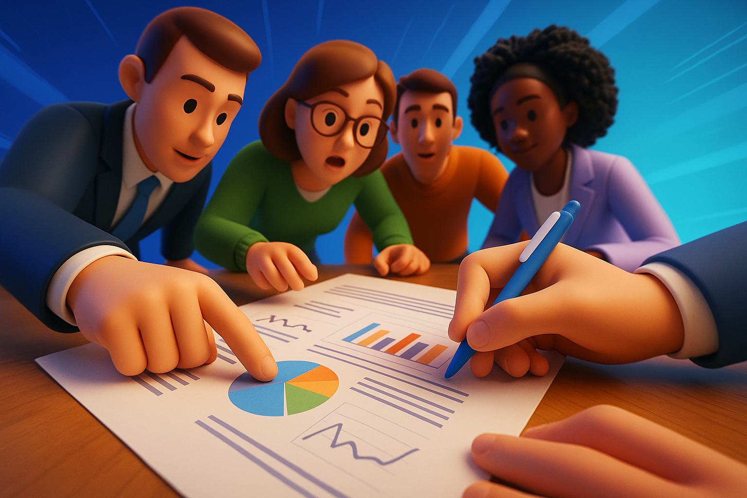 /Collection: /by davooda/Type: PNG/A dynamic scene of a business team collaboratively analyzing charts and documents. The group's focus is on a colorful pie chart, showcasing teamwork and strategic planning.