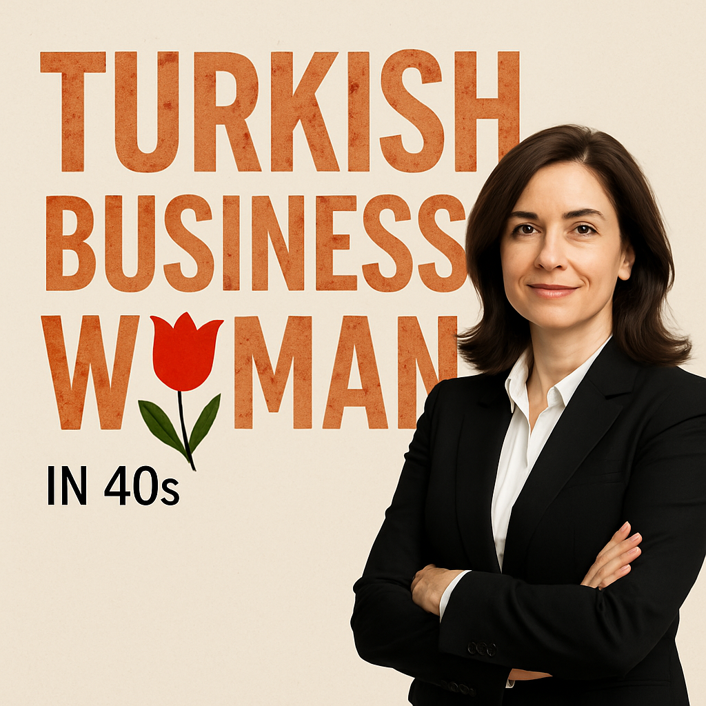 /Collection: /by davooda/Type: PNG/Stylish portrait of a confident Turkish business woman in her 40s, featuring bold text elements that emphasize her professional identity, suitable for branding or social media use.