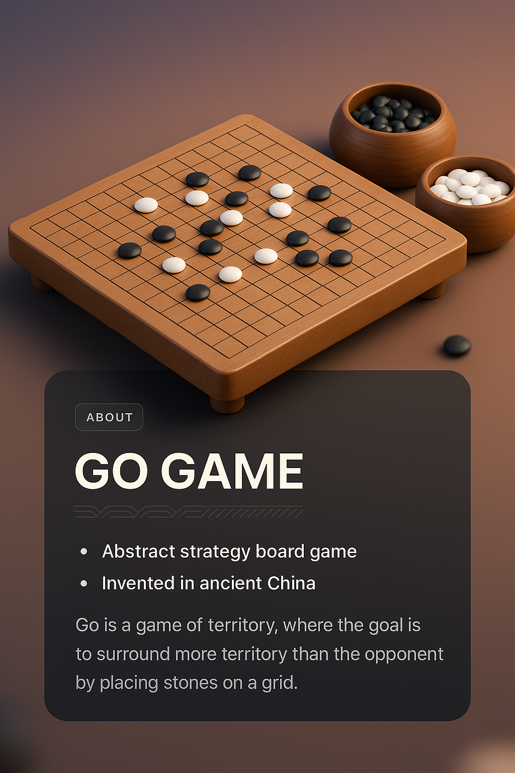 /Collection: /by davooda/Type: PNG/A visually rich 3D illustration of a Go game board with black and white stones. The design features integrated text blocks and a cohesive dark panel for added context.