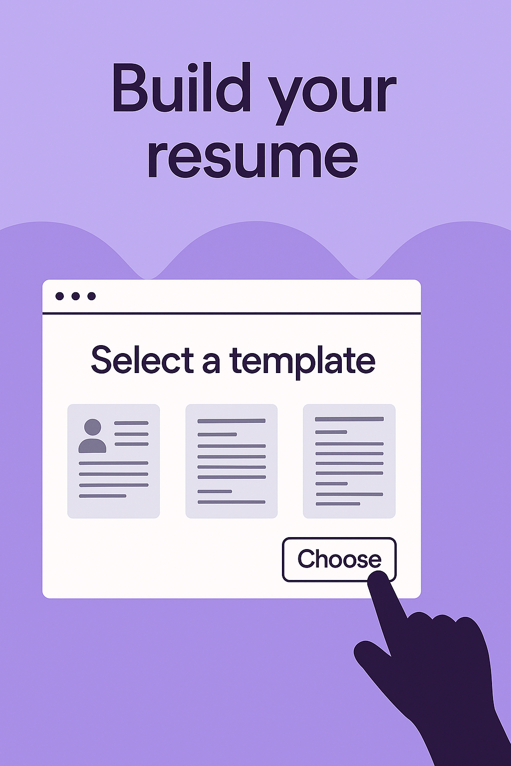 A modern user interface graphic showcasing a resume builder tool with template selection options, designed for digital platforms aimed at job seekers.