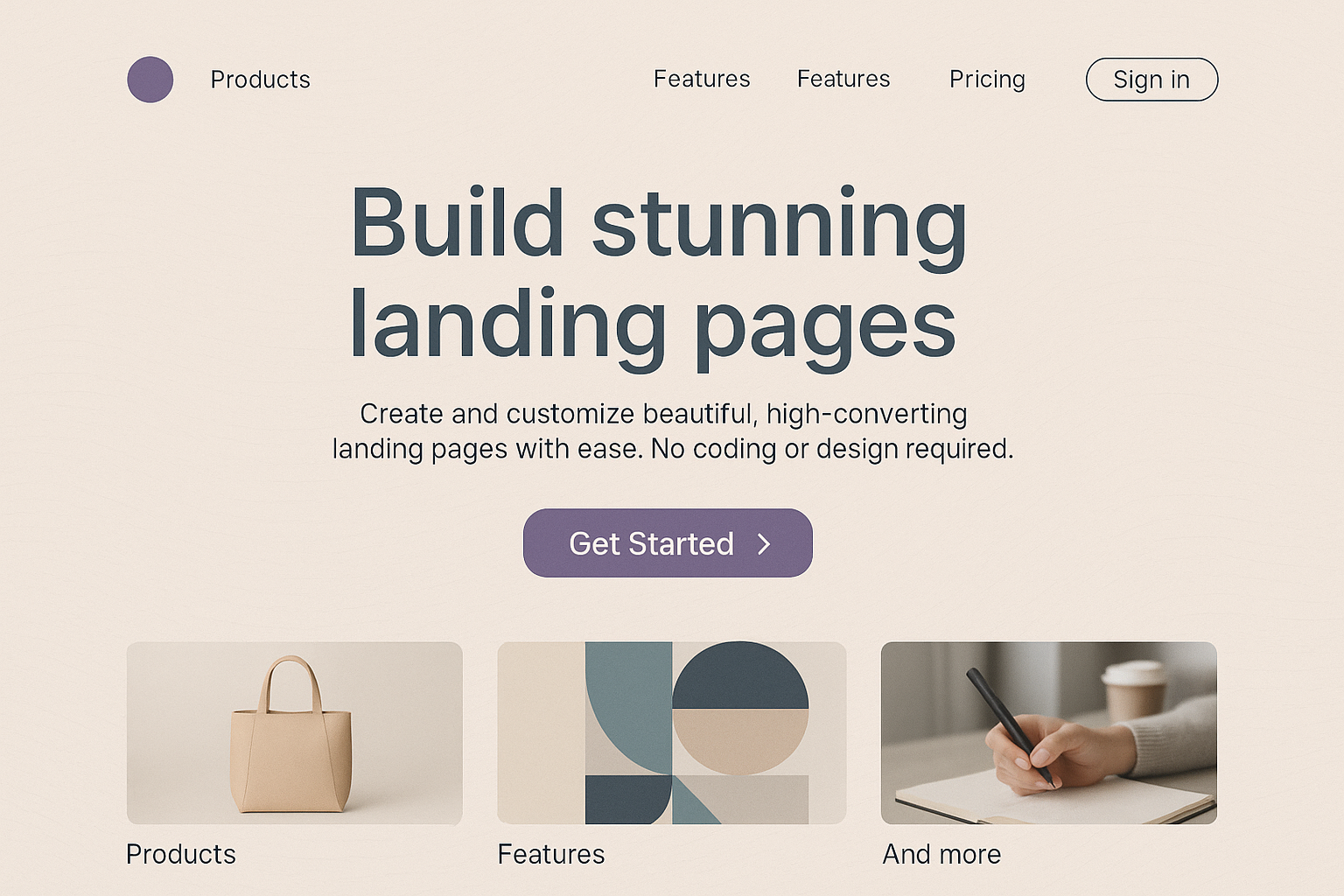 /Collection: /by davooda/Type: PNG/A sleek landing page layout featuring a prominent headline, action button, and three visual blocks for products. The design uses a soft pastel color scheme with modern typography.