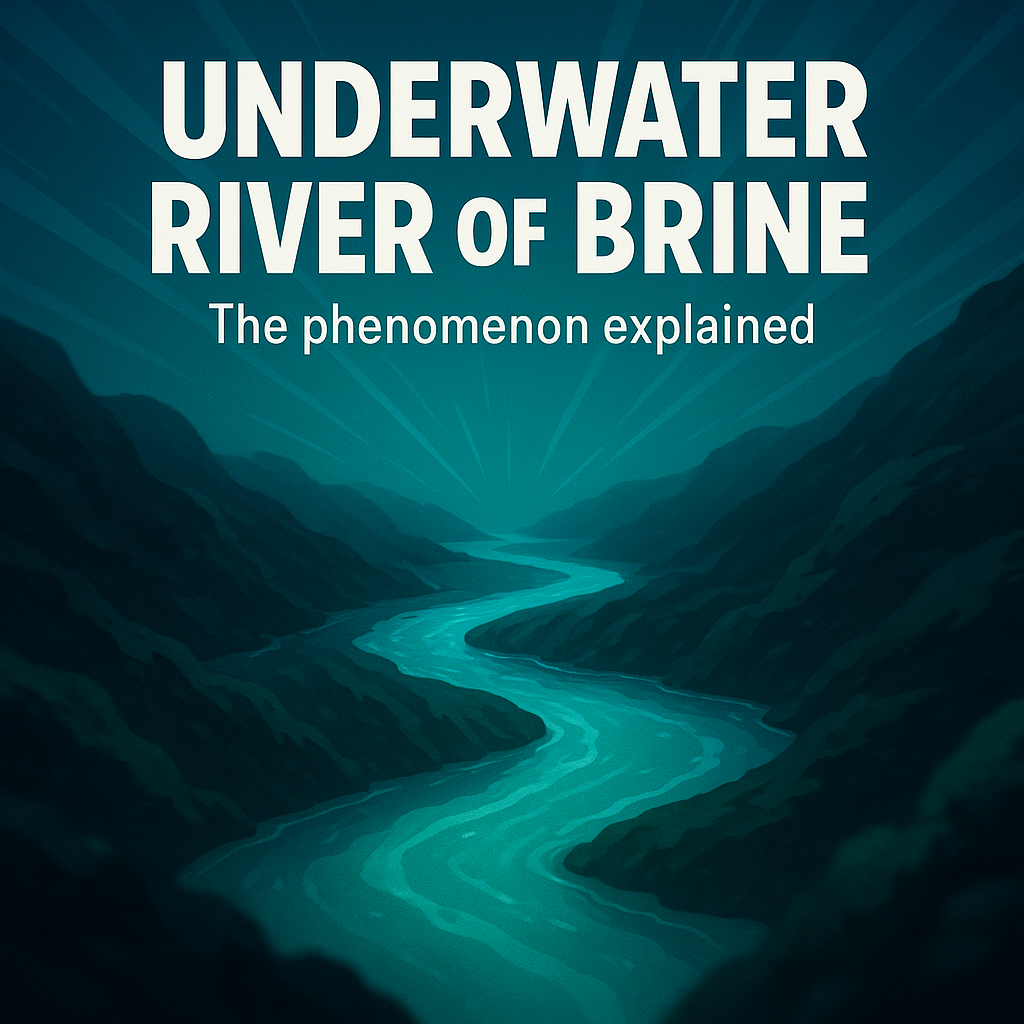 This infographic-style image depicts the concept of an underwater river of brine, using a visually engaging design with gradients and flowing lines. Ideal for educational content.
