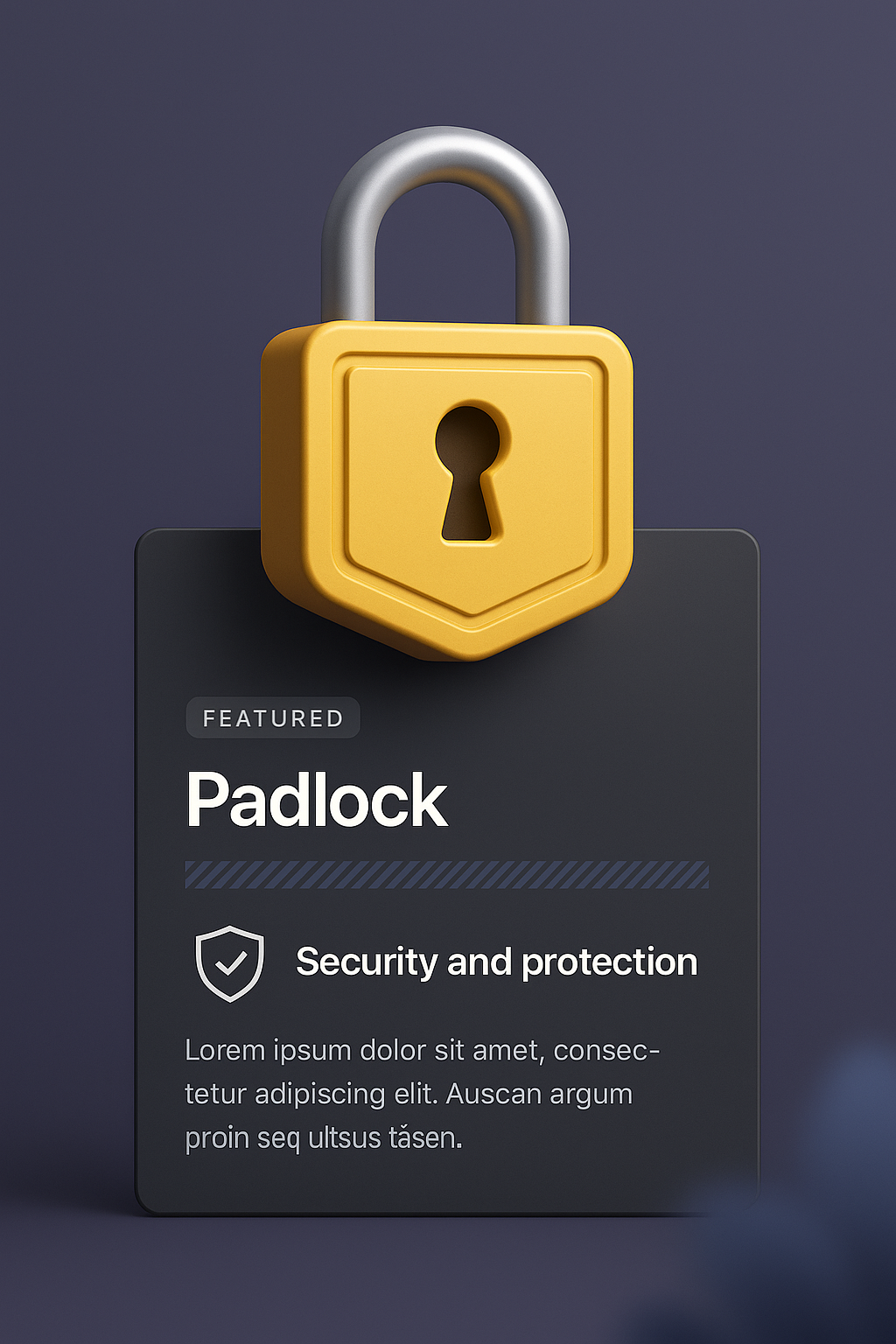 A 3D illustration of a yellow padlock set against a gradient background. It features a dark panel with a title and text block, emphasizing security.