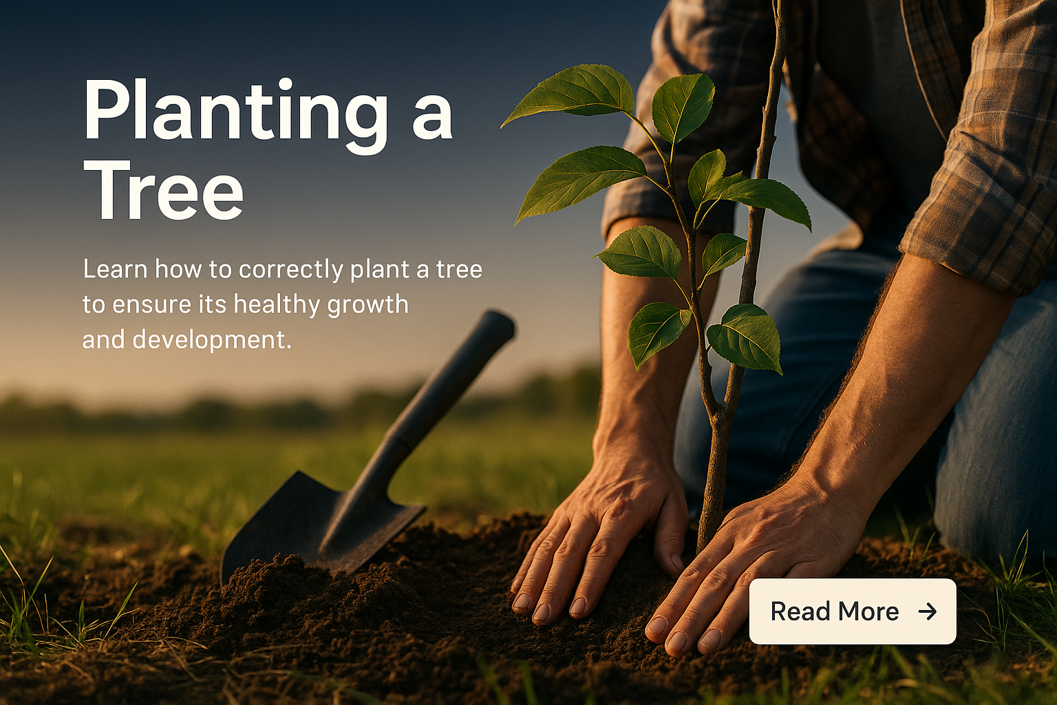 /Collection: /by davooda/Type: PNG/A web design concept featuring a hands-on guide for planting a tree. The image shows a person planting a tree with a shovel, accompanied by a clear call-to-action button.