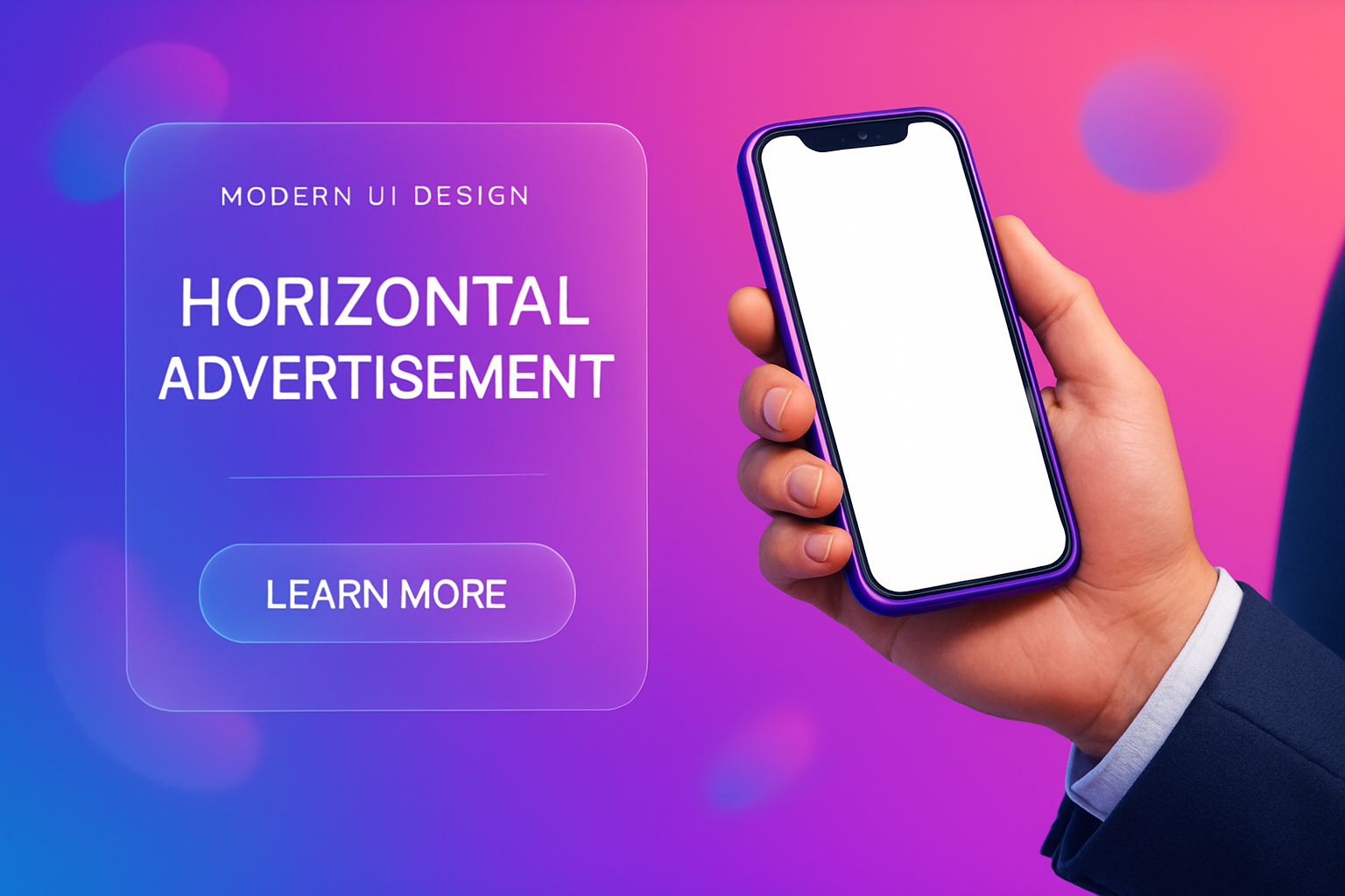 /Collection: /by davooda/Type: PNG/A modern advertisement featuring a purple phone in a man's hand, set against a vibrant gradient background. The layout includes glassmorphism panels and a call-to-action button.