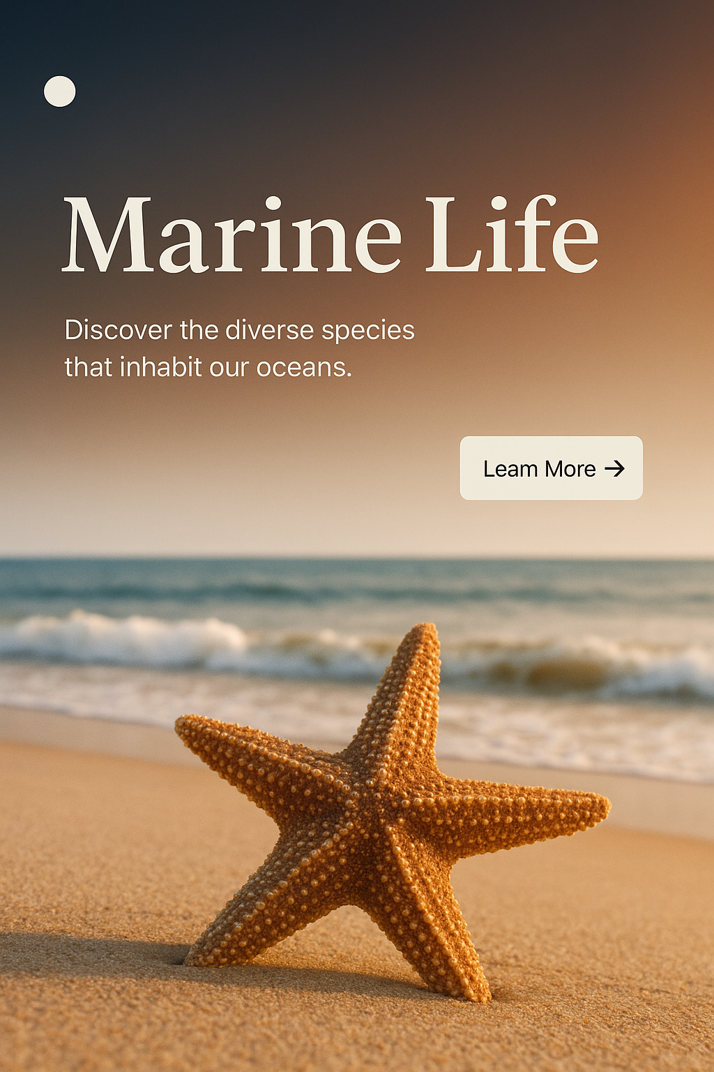 /Collection: /by davooda/Type: PNG/A modern web design concept showcasing a starfish on a beach, with a gradient background and clear typography. The layout includes a title, text block, and action button.