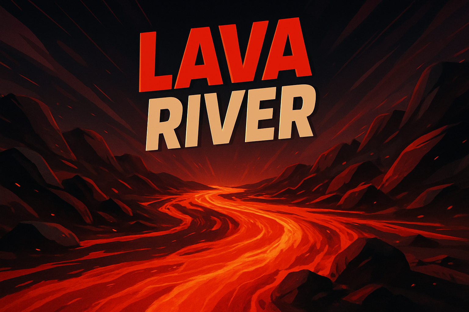 Vibrant depiction of a flowing lava river amid rocky terrain, featuring bold typography. The scene showcases dynamic elements and layered composition, emphasizing movement and energy.