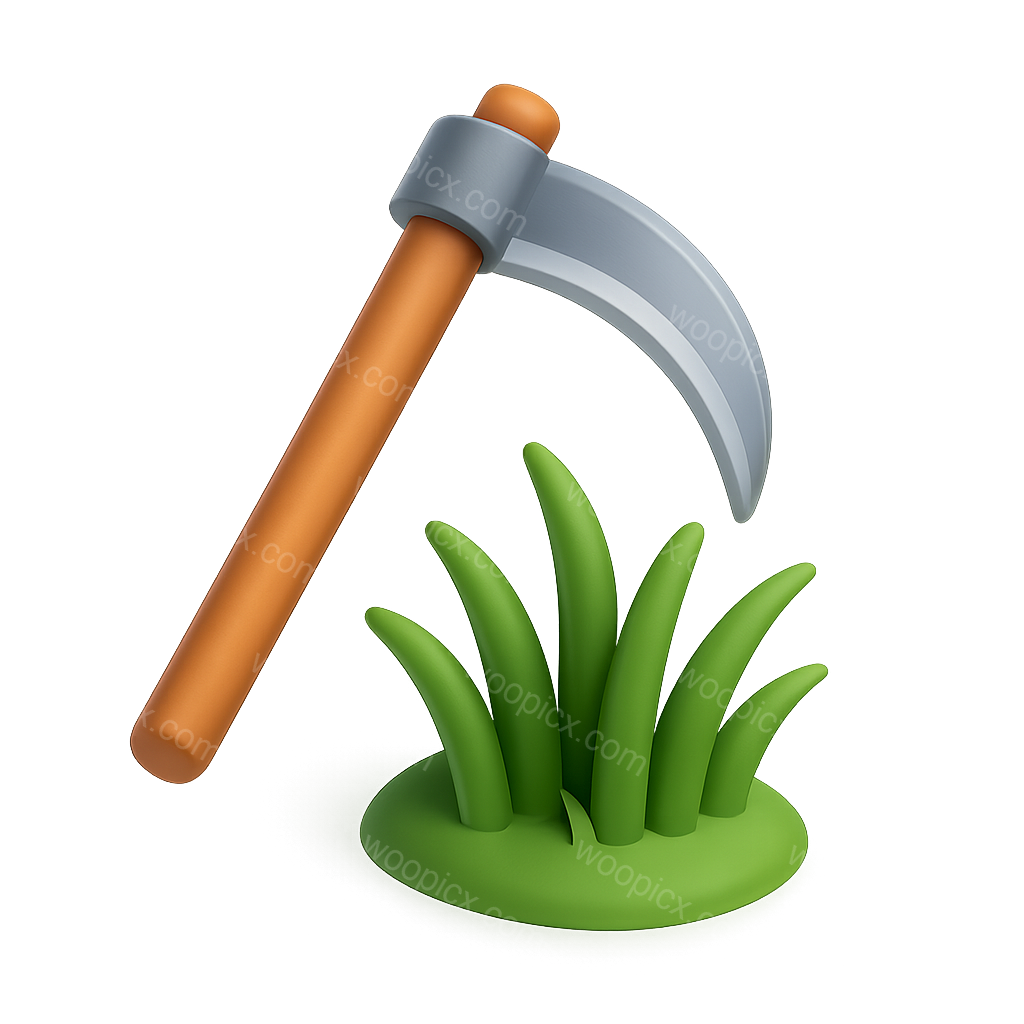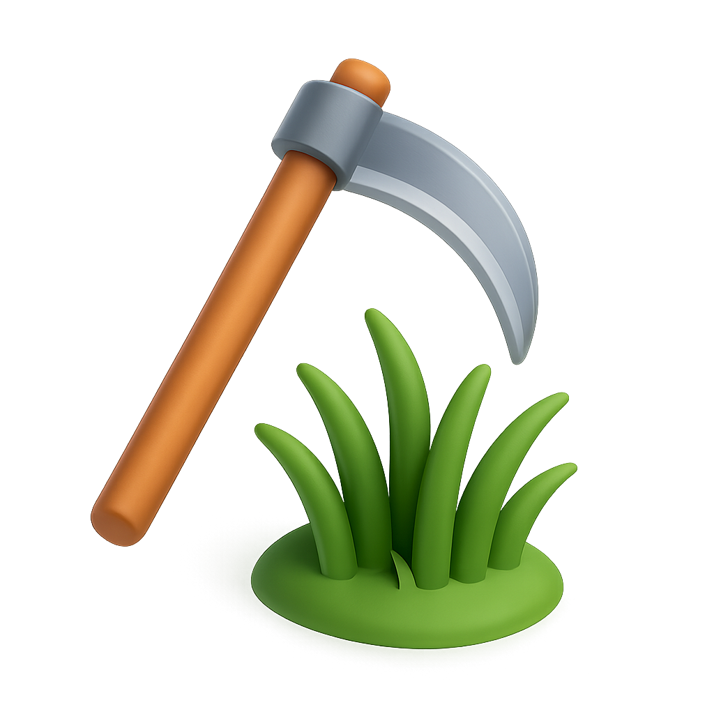 A 3D rendered icon featuring a scythe with a brown handle and a silver blade, positioned above a patch of green grass. The design has a vibrant, glossy finish.